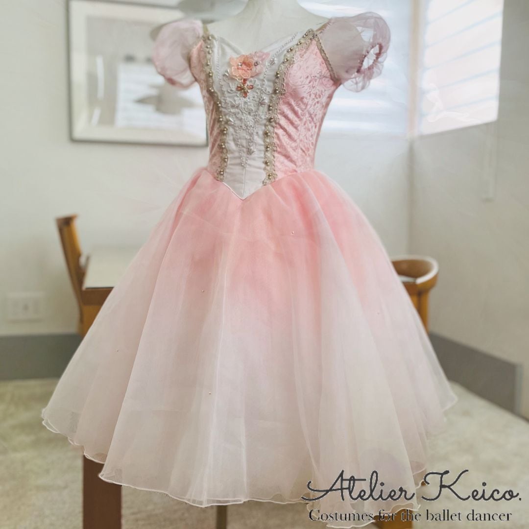 パフスリーブのお袖や、サーモンピンクのグラデーションのスカート、胸元のデザインにもこだわりを詰めています